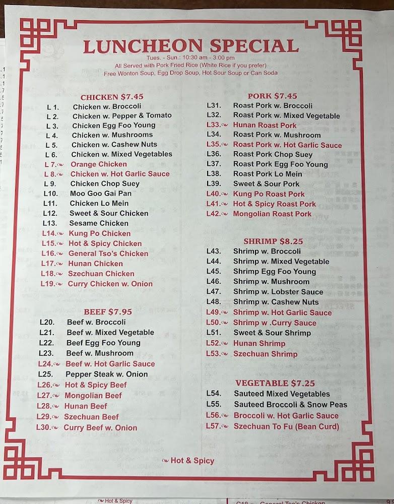 The menu at Chang Jiang offers a wide selection of Chinese dishes, with over fifty options spanning various meat and vegetable categories. Popular choices include chicken with broccoli and shrimp with mixed vegetables. The restaurant excels in providing classic favorites like beef egg foo young and pork with hot garlic sauce. Diners can share smaller portions or indulge in hearty meals, perfect for family style dining. Moreover, vegetarians can delight in fresh sautéed vegetable dishes while enjoying the same authentic flavors that Chang Jiang is known for. Each dish promises quality ingredients and traditional cooking techniques, ensuring that every bite is satisfying.